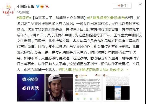 近日,知名男歌手吴亦凡被爆料陷入舆论漩涡。一位女性网友爆料称,吴亦凡以各种方式物色、诱骗年轻女性发生关系,并称除了自己还有其他女性受害者,其中包括未成年人。7月19日,吴亦凡发布声明,对这些指控进行了否认。工作室发声明称该女生造假,已报案。此事持续发酵,多家与吴亦凡合作的品牌方隐藏官宣吴亦凡代言的微博。目前,多个品牌终止与吴亦凡合作,相关宣传内容也被删除。此事沸沸扬扬,莫衷一是,需要司法机关介入厘清,防止对青少年的价值观产生误导。私德不修,人生必难行稳致远,这是铁律。静等警方介入厘清,期待真相早日水落石出。法律面前人人平等,流量明星也不例外,相信法律不会冤枉一个好人,也不会漏掉一个恶人。