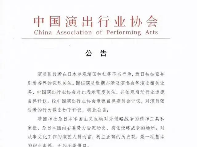 今天,中国演出行业协会发布公告,对演员张哲瀚参观靖国神社的不当行为进行道德申斥,并根据《演出行业演艺人员从业自律管理办法》的规定,要求会员单位对其进行从业抵制。