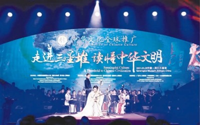 “走进三星堆读懂中华文明”主题活动现场,交响乐队演奏《太阳·玄鸟》。
