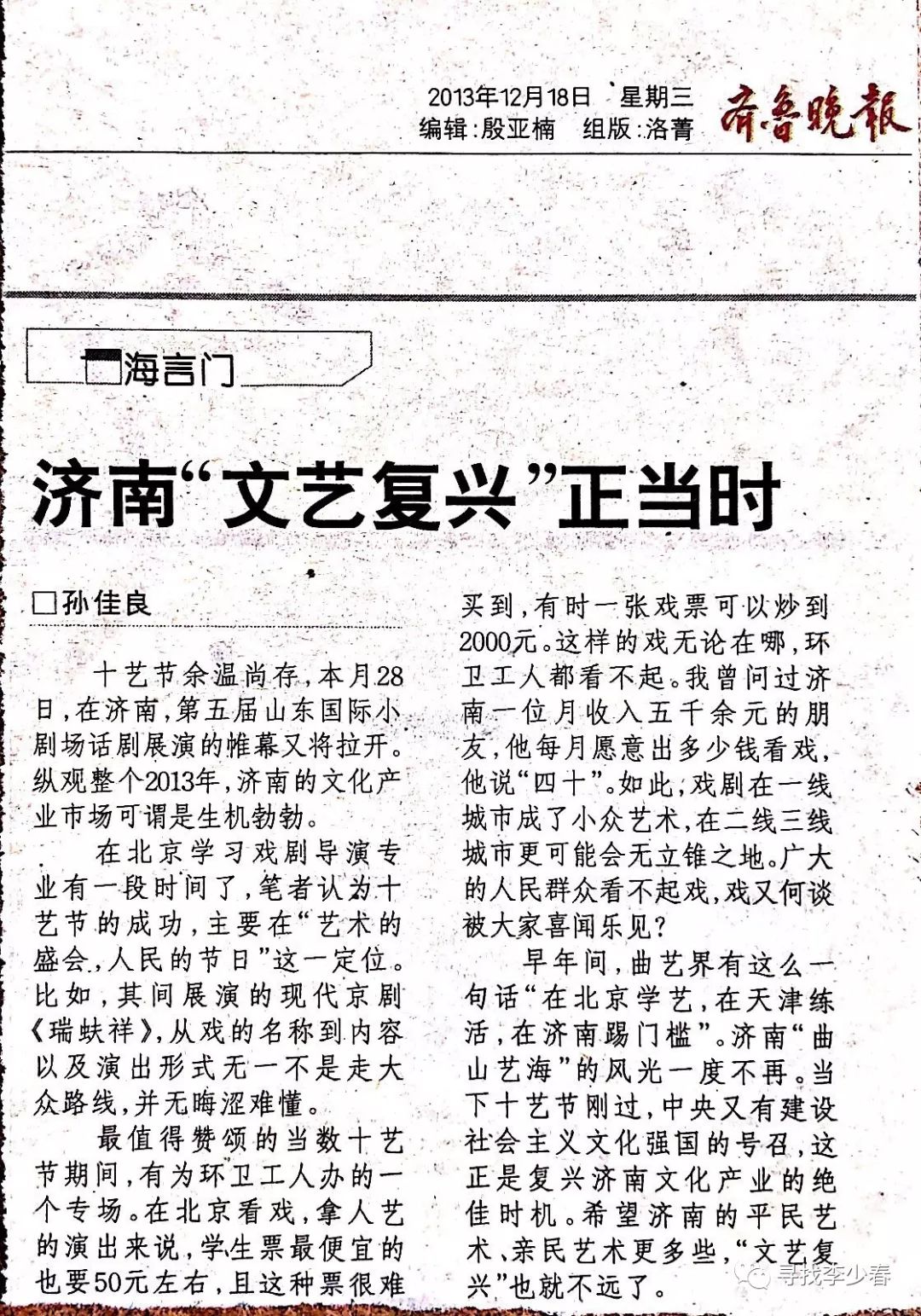 写在前面:七年前,在全城济南举办了第十届中国艺术节,欣喜于济南“文艺复兴”的大好契机,对家乡的文化艺术事业充满了期待,遂在《齐鲁晚报》发表小文《济南“文艺复兴”正当时》……
