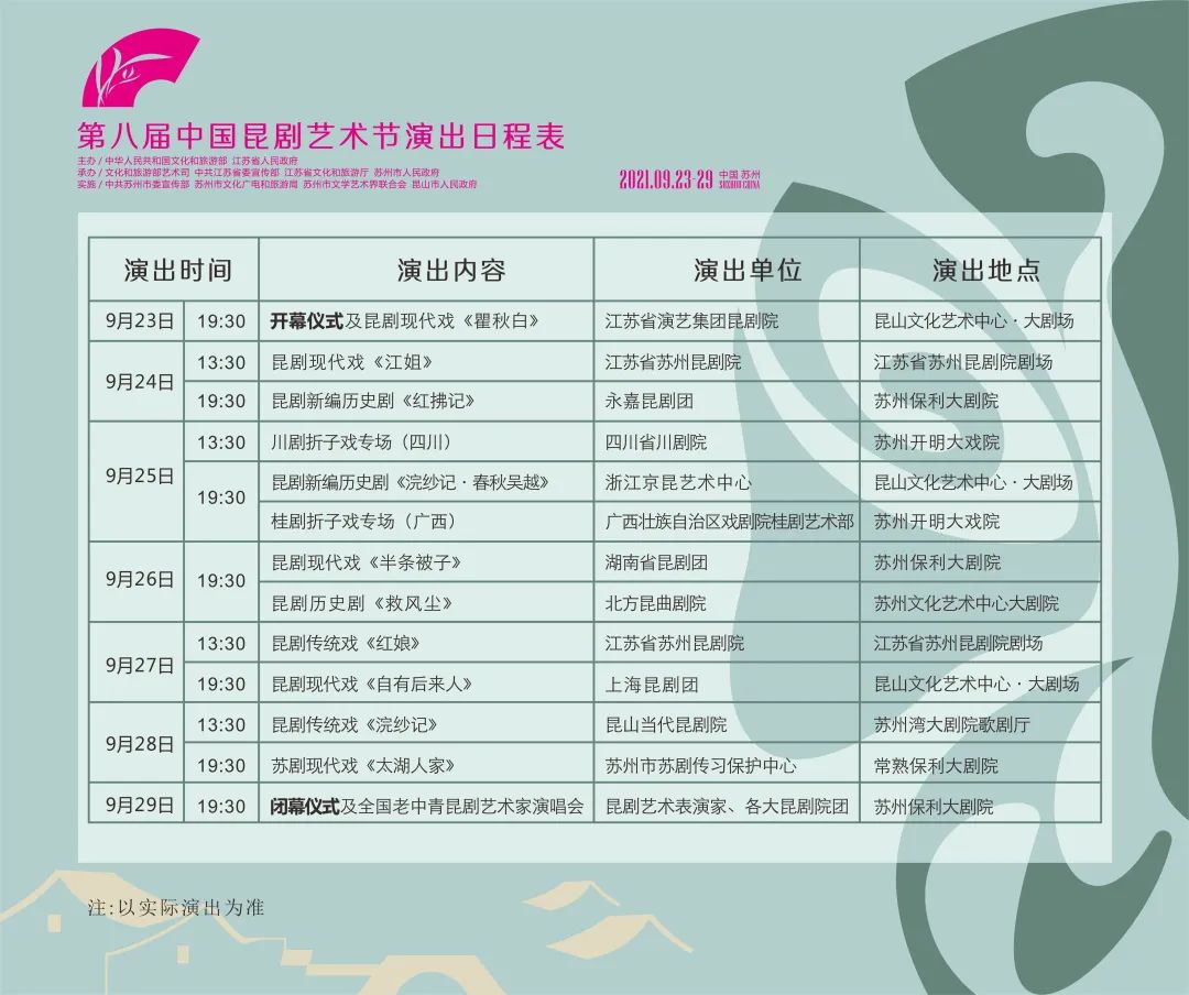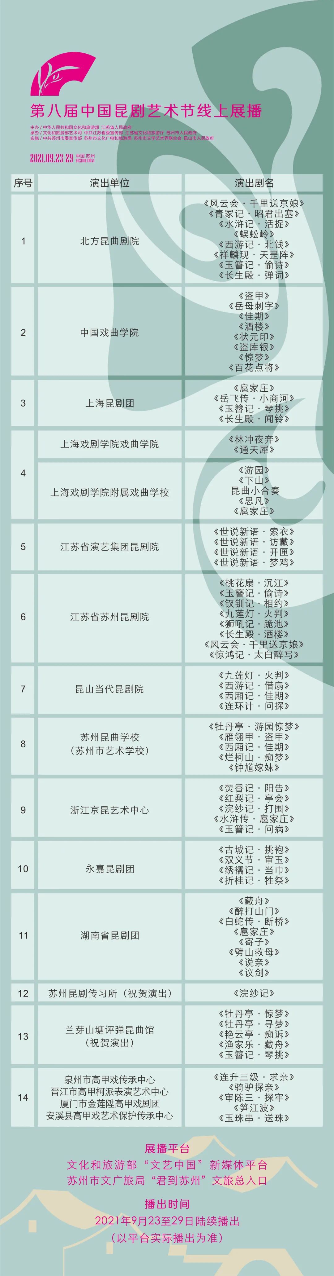 其中,9台昆剧大戏及地方戏曲剧种折子戏组台将在苏州举办线下演出,每台剧目演出1场,同时在“文艺中国”“君到苏州”等新媒体平台上开展线上演播;昆剧传统折子戏组台将以视频形式参加线上演播。